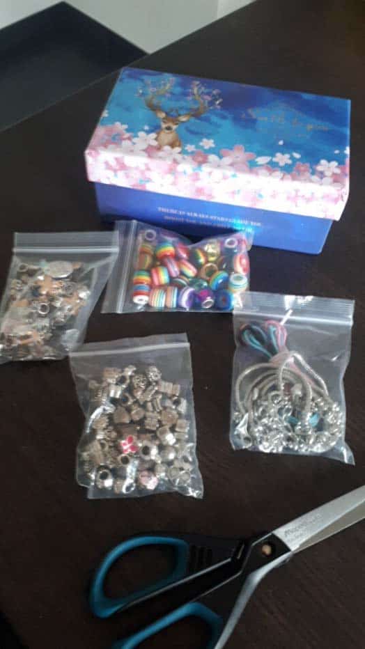 | A Csomag Tartalma: | 3x karkötő | 20 db színes gyöngy | 20 db különböző formájú karkötő dekoráció | 20 db különböző formájú színes medál | 1x díszdoboz |