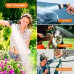 A kerti tömlőcsatlakozóval és szórófejekkel ellátott nagyszabású csomaghoz tartozik egy öntözőpisztoly is, amely a fej elfordításával 8 különböző vízsugarat hoz létre! A pisztolyon található kar segítségével szabályozhatja a vízsugár erősségét és található rajta egy csat is, amely lehetővé teszi a víz áramlását a kar megnyomása nélkül is!