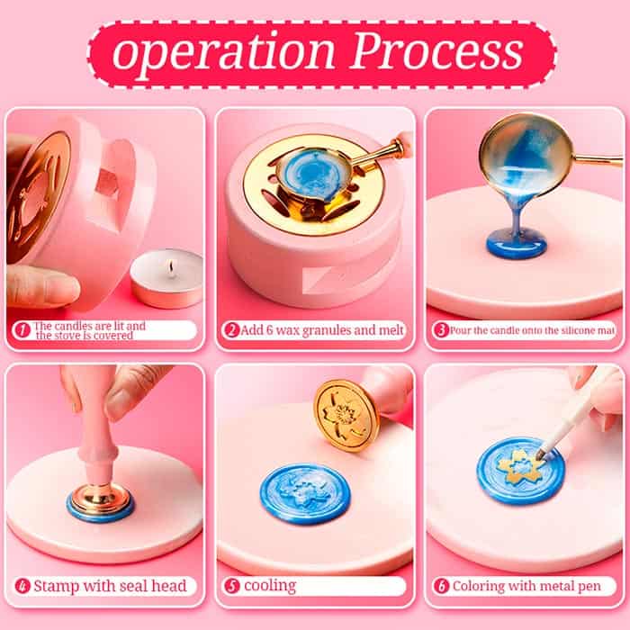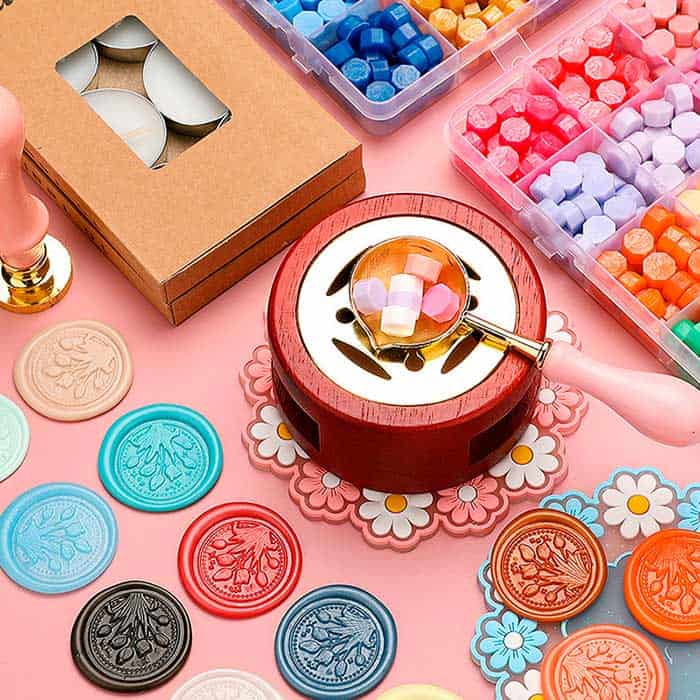 | A Csomag Tartalma: | 10x pecsétnyomó motívum, 1x csipesz, 1x kanál az olvasztott viaszhoz, 1x melegítő a viasz olvasztásához, 1x fogantyú a pecsétekhez, 1x szilikon alátét, 1x ceruza, 1x tároló 10 különböző színű viasszal (fehér, lila, kék, zöld, sárga, 3 különböző rózsaszín, narancs, piros) |